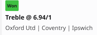 I finally had a decent winner, Liverpool, Ipswich, Lincoln and Cardiff all to win and >2.5 goals, £10 at 24/1 ![]()