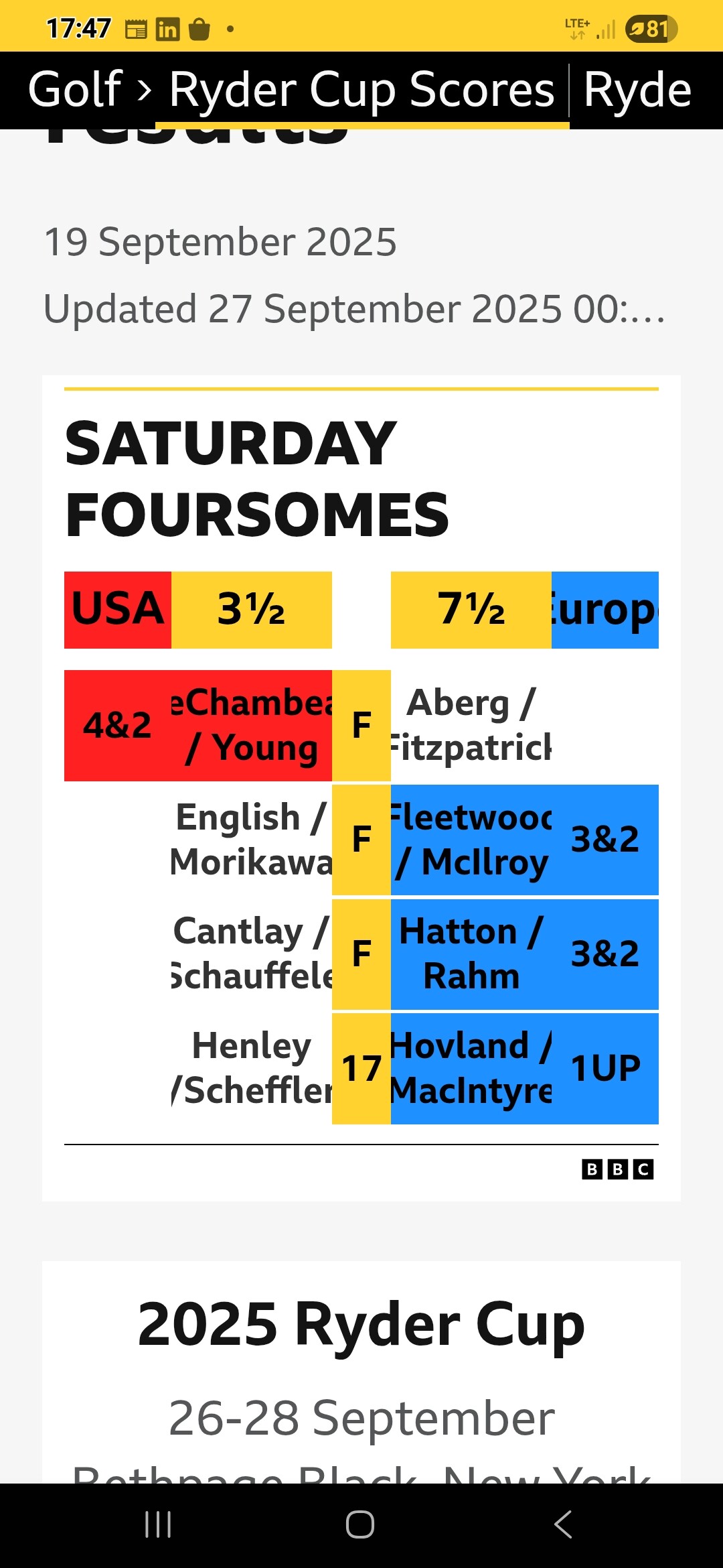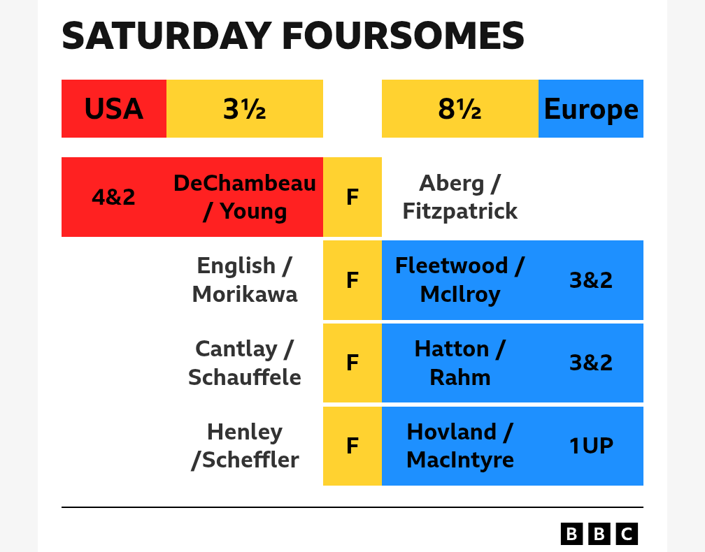1st time ever away team won all 3. US had 20 birdies in both 4 somes and got smashed